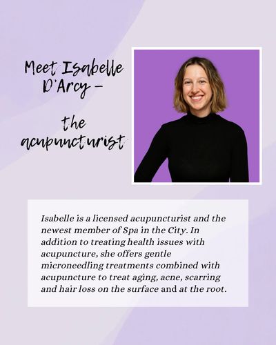 Have you been curious about acupuncture? Do you have any back pain, neck pain, knee pain, stress, sleep issues, digestive issues, or any other issue you would like support with? We are now offering acupuncture treatments at Spa in the City with our newest member, Isabelle D’Arcy—a licensed acupuncturist.